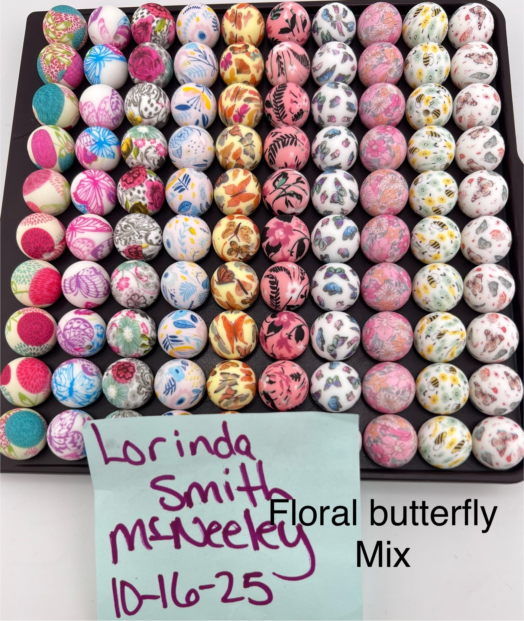 Set of 100 15mm Silicone Floral Butterfly mix Print Bead set